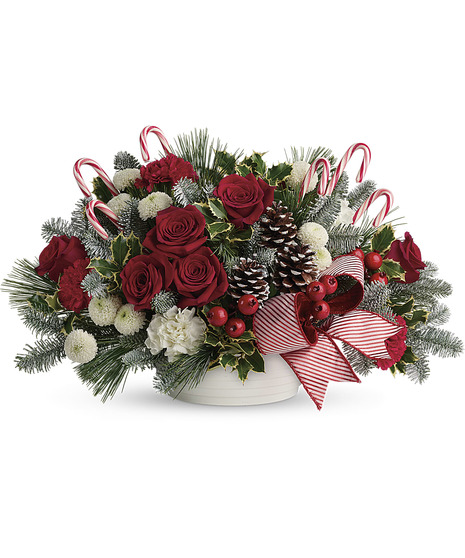 Jolly Candy Cane Bouquet: Festive Holiday Flowers in a Wooden Dish