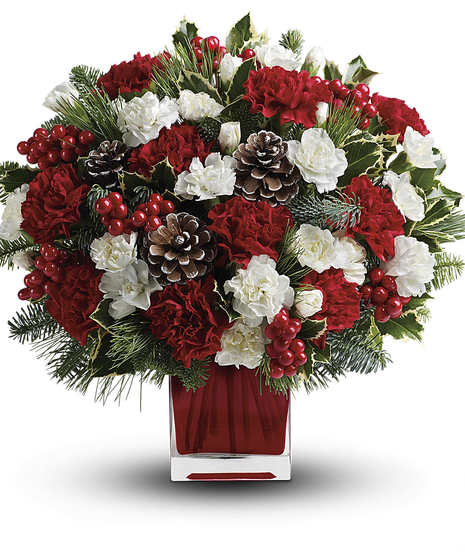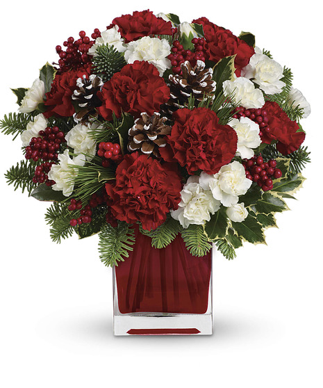 Red carnations and white miniature carnations are accented with tips of noble fir, white pine, holly and assorted greens. Delivered in Teleflora's bright red glass cube.