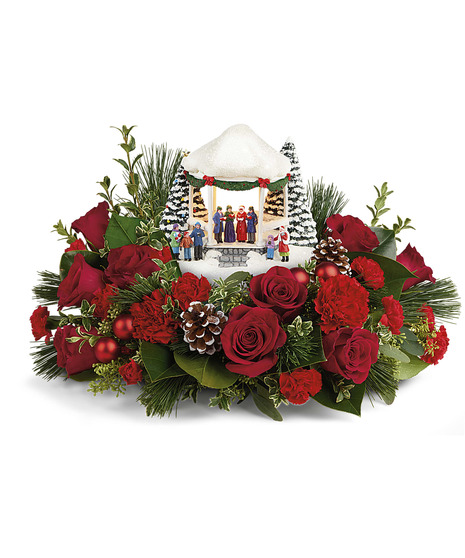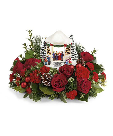 Adding to its charm, it comes with a keepsake designed by Thomas Kinkade. This keepsake captures the essence of carolers in the snow, bringing a picturesque winter scene into your home. This arrangement is not just a celebration of flowers; it's a testament to the artistry of the season!