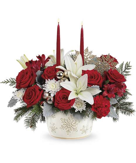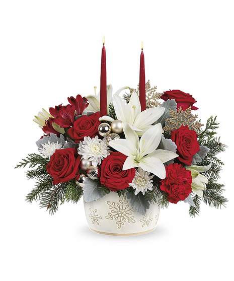Winter Wishes Bouquet with red roses, white lilies, carnations, winter greens, and two candles in a snowflake dish.