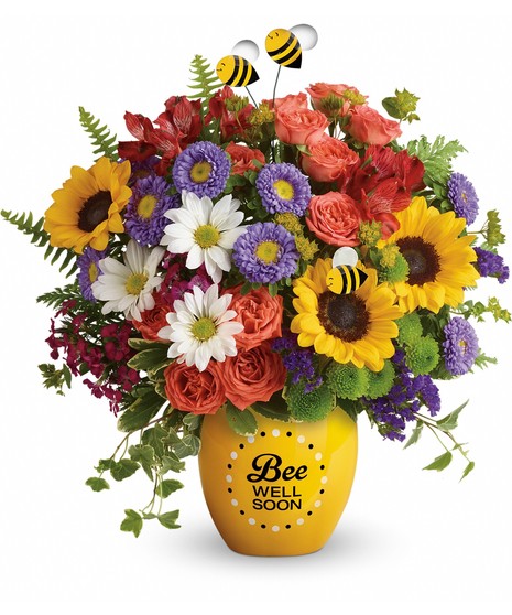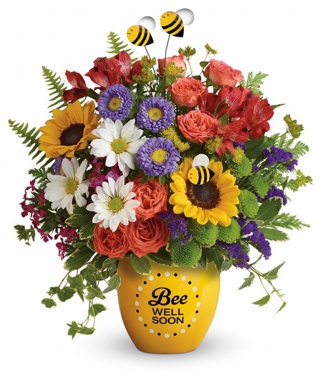 Boost their spirits and brighten their day with this garden of wellness! Hand-delivered in a sweet ceramic "Bee Well Soon" pot, this colorful arrangement of roses, alstroemeria and asters is abuzz with delightful bee decorations - and your very best wishes for a speedy recovery.