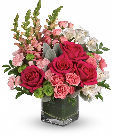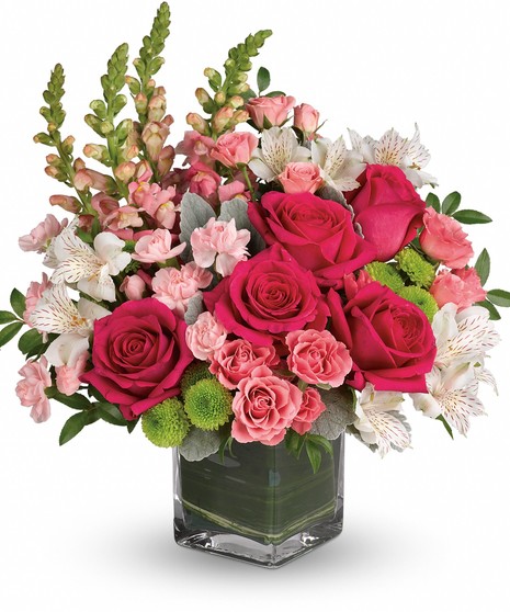 Hot pink roses, pink spray roses, white alstroemeria, pink miniature carnations, green button spray chrysanthemums and pink snapdragons are arranged with dusty miller, huckleberry and variegated aspidistra leaf. Delivered in a clear cube vase.
