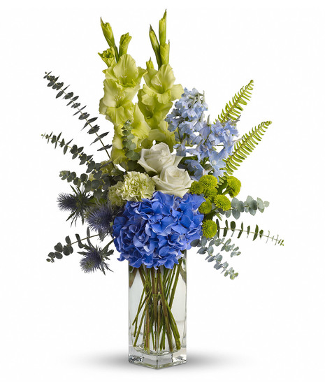 Striking blue hydrangea, green roses, carnations and gladioli along with light blue delphinium, blue eryngium, eucalyptus and fern are on wonderful display, when delivered in an elegant clear glass vase.