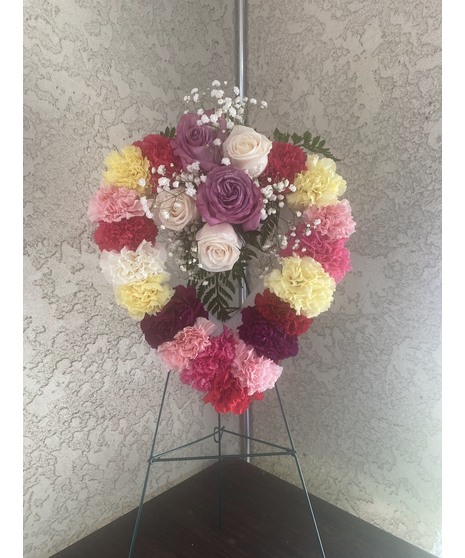 We use assorted carnations and roses to offer this lovely design at a discounted price but you can specify colors for an additional price! The heart is approximately 12" diagonally and made in styrofoam. The carnations are attached with wood picks and pressed into the styrofoam. This design comes on a 2-foot stand.