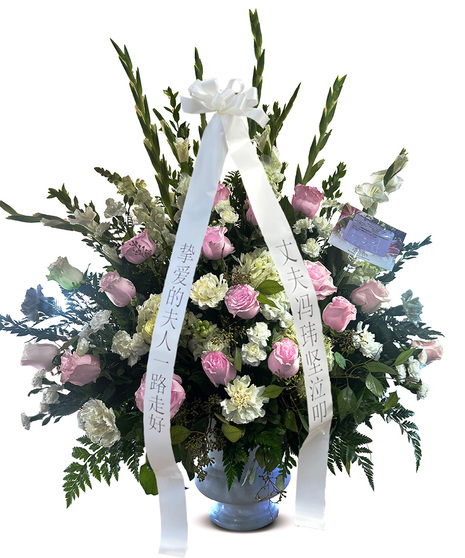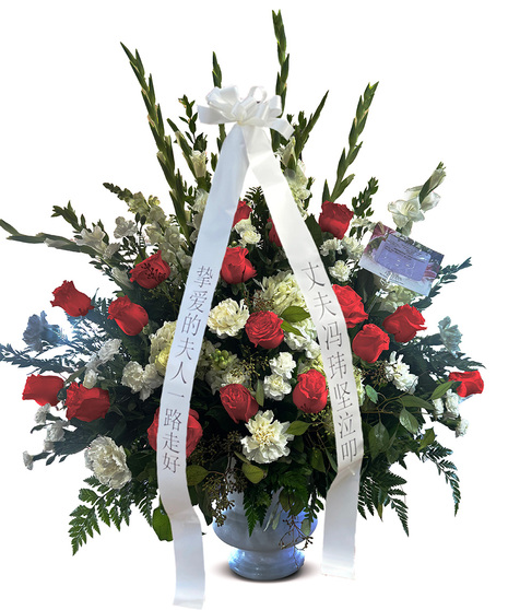 Our Funeral Arrangement is a respectful and elegant floral tribute crafted entirely with white flowers, symbolizing peace and remembrance in traditional Chinese funeral customs. Designed in a classic white urn vase, this arrangement features white roses, carnations, mini-carnations, gladioli, and snapdragons, accented with salal, leatherleaf, and seeded eucalyptus for texture and fullness. It includes two Chinese condolence banners—a meaningful addition that allows the sender to share heartfelt messages of sympathy and respect.