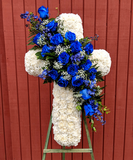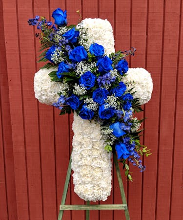 This beautiful cross is made of an assortment of beautiful white flowers such as China mums and carnations, surrounded by a salal leaf border, and a lovely blue cluster with blue roses and delphinium. Arrangement arrives on a stand.