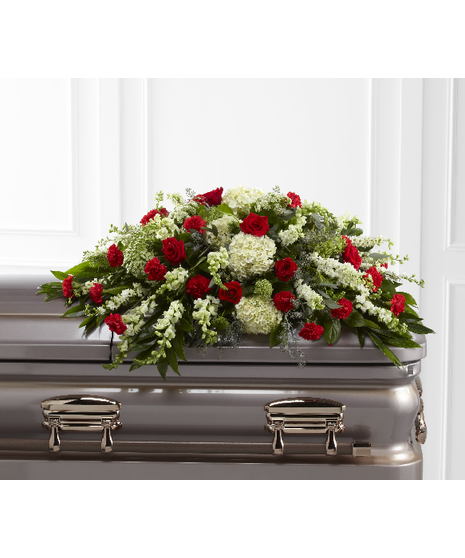 The Dearly Departed Casket Spray is a wondrous presentation of fresh color and beauty. Rich red roses and carnations are eye-catching and elegant in an arrangement of white hydrangea, larkspur, snapdragons, Queen Anne's Lace and assorted lush greens to create a lovely display meant to bedeck the top of their casket, bringing comfort and peace to those grieving the loss of the departed.