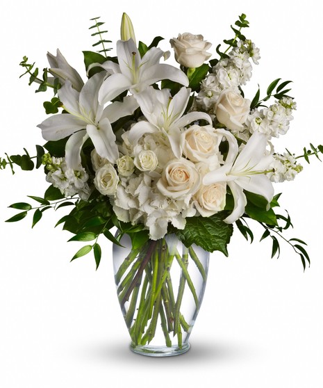 Beautiful flowers such as white hydrangea, spray roses and stock, white roses, eucalyptus and more fill a tall glass vase.