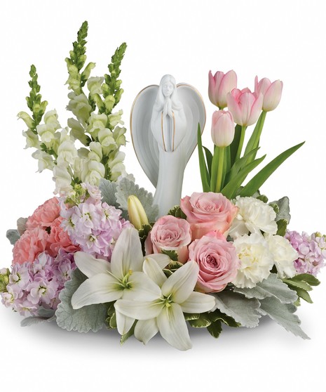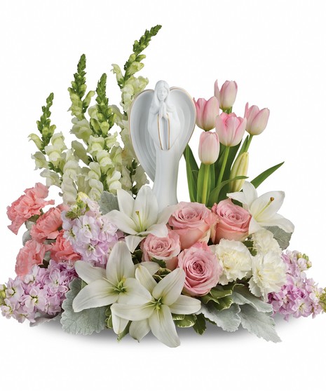 This lovely arrangement of light pink roses, light pink tulips, white asiatic lilies, light pink carnations, white carnations, white snapdragons and light pink stock is accented with dusty miller and variegated pittosporum. Delivered with Angel of Grace keepsake.