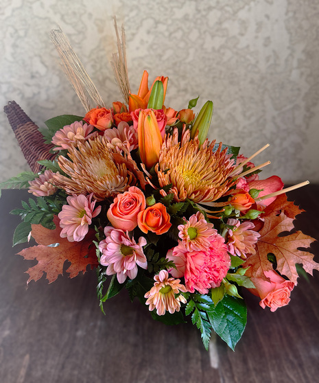 Celebrate the bountiful beauty of fall with the Harvest Abundance Cornucopia. This stunning arrangement features vibrant orange roses, orange spray roses, orange carnations, bronze spider mums, and peach daisy chrysanthemums, paired with the rich tones of orange Asiatic lilies. Accented with wheat and fall leaves, all thoughtfully arranged in a classic wicker cornucopia, this centerpiece brings warmth and elegance to your seasonal celebrations. Perfect for Thanksgiving tables, autumn gatherings, or as a thoughtful gift, the Harvest Abundance Cornucopia is a charming nod to the harvest season.