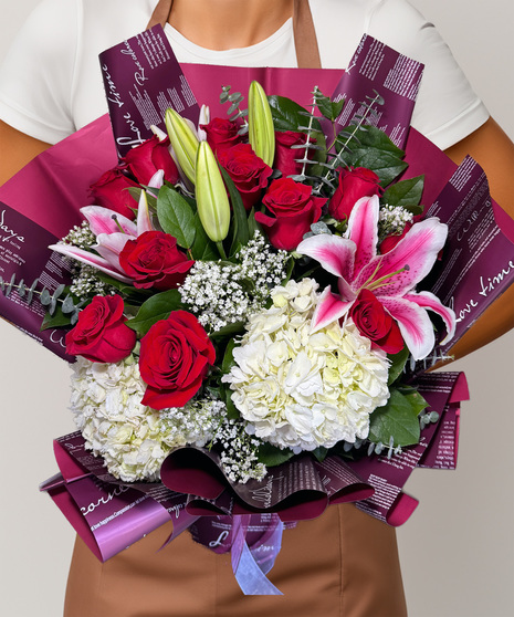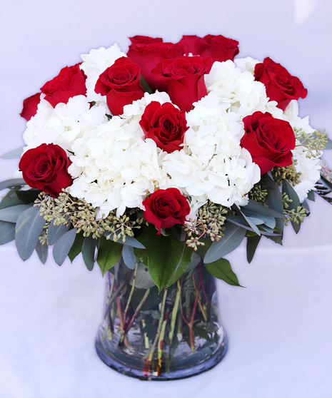 Lovable Together Compact Bouquet with Red Roses, White Hyrangea, Red Carnations & More