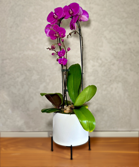 Introducing "Orchid Duet," a captivating pairing of elegance and grace. This exquisite planter features a striking ensemble of orchids, with one large and one small purple phalaenopsis, artfully arranged in a pristine white ceramic cylinder. Perched on a sleek black stand, the contrast adds a touch of modern sophistication to the display. Adorned with decorative moss and river rock, the Orchid Duet radiates tranquility and beauty, making it a perfect centerpiece for any space. Bring the allure of dual orchids into someone's home or office, creating a symphony of floral splendor with the Orchid Duet – a harmonious blend of botanical charm and contemporary style.