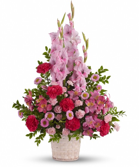 A mix of fresh pink blossoms like gladioli, alstroemeria, carnations and more are lovingly arranged in a white basket. Approximately 23" W x 33" H