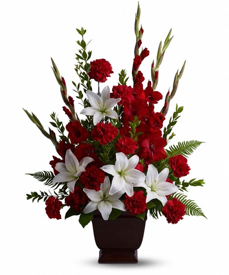 Dazzling red roses and gerberas, brilliant white chrysanthemums and larkspur are arranged with gentle greens to create a strong yet soothing arrangement. Approximately 39" W x 21" H