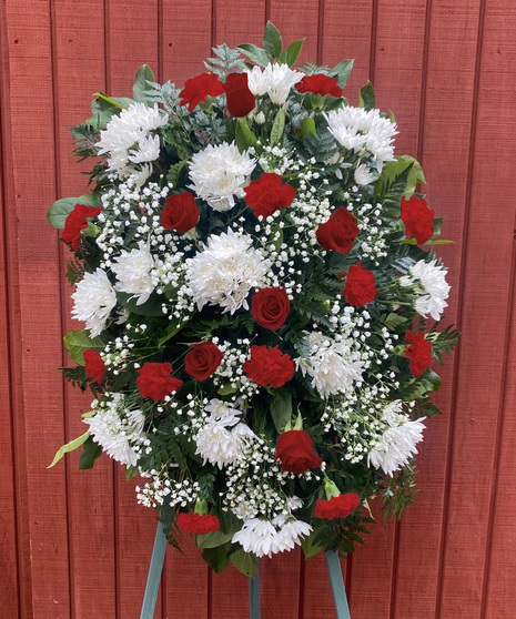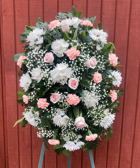 The Warm Comfort Funeral Spray is a beautiful tribute to honor the life of a loved one who has passed away. This funeral spray features a lovely arrangement of roses, carnations, and white cushion mums, expertly arranged to create a calming and peaceful display. Accented with delicate baby's breath and lush salal and leatherleaf, this funeral spray exudes a sense of warmth and comfort, making it the perfect way to offer solace and support to those who are grieving. Measuring 30 inches in height and 24 inches in width, this funeral spray comes on a sturdy 5 foot stand, ensuring that it will be displayed during the funeral service or memorial.