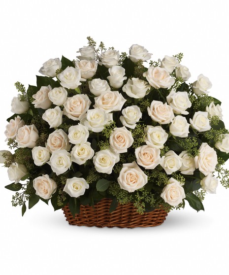 White and crème roses with fragrant seeded eucalyptus beautifully presented in a large basket. Approximately 25" W x 20 1/2" H ?